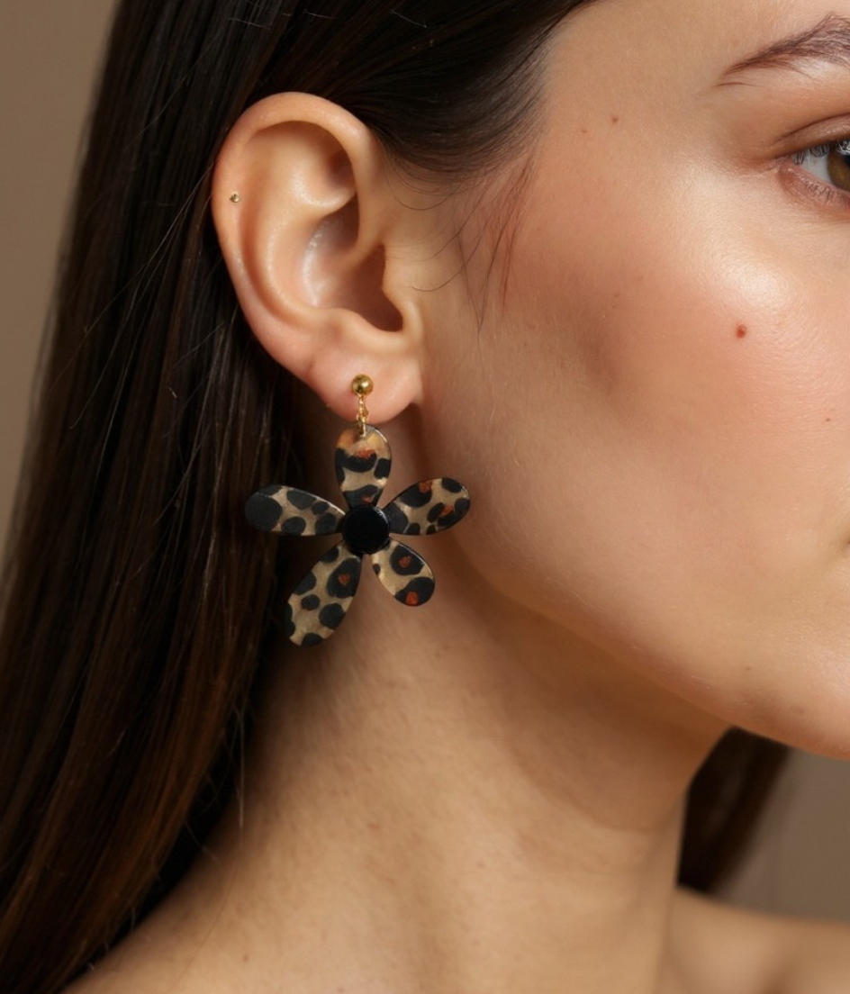 Les boucles d'oreilles Kora allient le charme rétro d'une fleur surdimensionnée à un imprimé animal en résine scintillante, pour une touche d'originalité et de style. Légères et élégantes, elles sublimeront n'importe quelle tenue d'une note audacieuse et tendance.