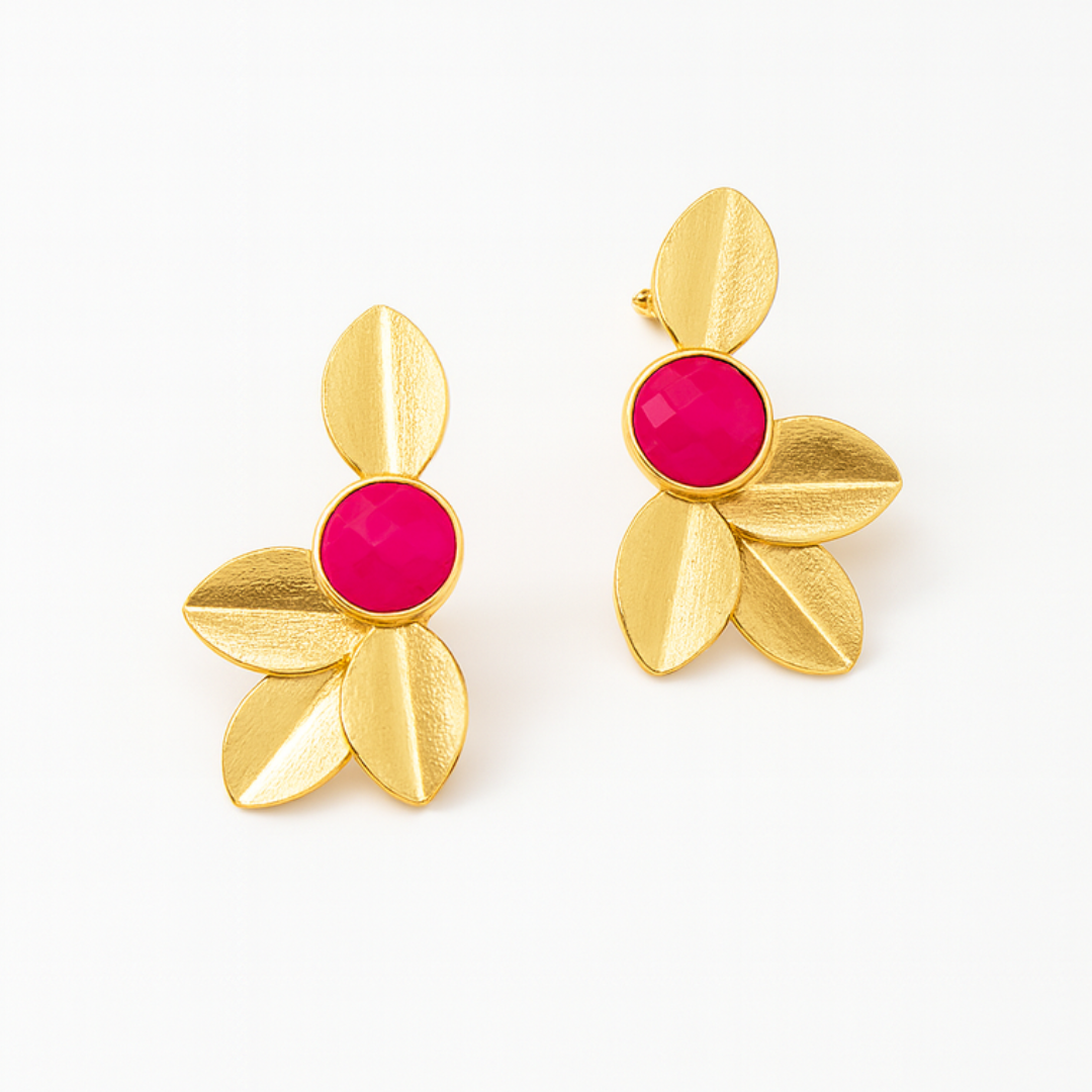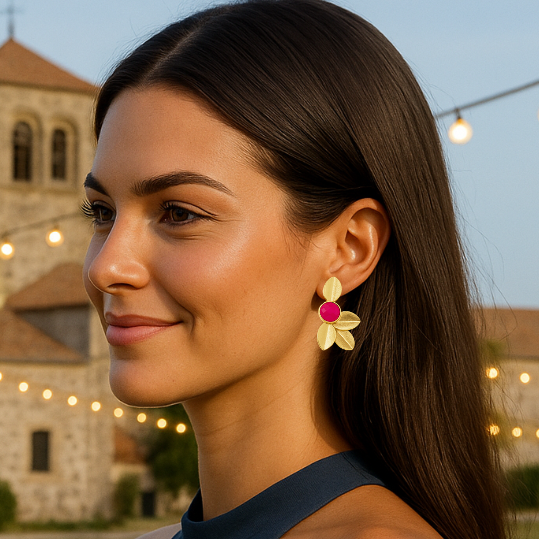 Les boucles d'oreilles Matilda allient la puissance de l'or à la fraîcheur d'une pierre fuchsia qui illumine tous les looks. Leur design en feuille d'or mat se distingue par sa pierre centrale facettée, créant un style unique qui sublimera toutes vos tenues, d'une tenue d'invité à une tenue de soirée.