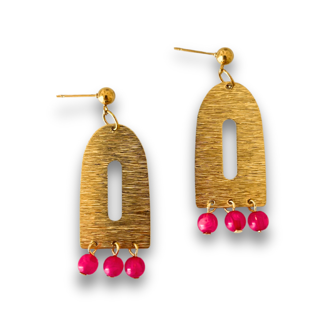 Les boucles d'oreilles Maika allient formes géométriques, texture dorée et touche fuchsia vibrante. Parfaites pour celles qui recherchent des accessoires uniques, joyeux et fonctionnels.