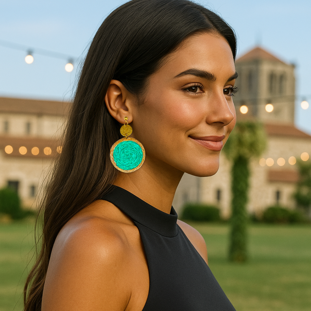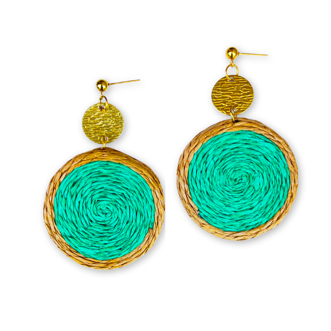- Design : Disque doré texturé + cercle en raphia naturel tressé turquoise