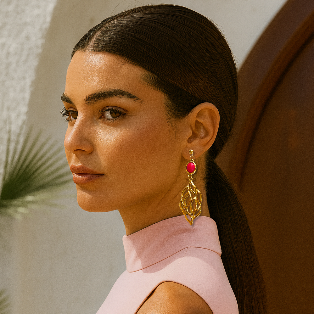 Les boucles d'oreilles Valentina ont tout pour plaire : un design dynamique en or, des pierres colorées déclinées en cinq teintes – bougainvillier, fuchsia, blanc, bleu et lilas – et une allure à la fois légère et élégante. Parfaites pour les mariages, les événements et les tenues flamenco modernes.