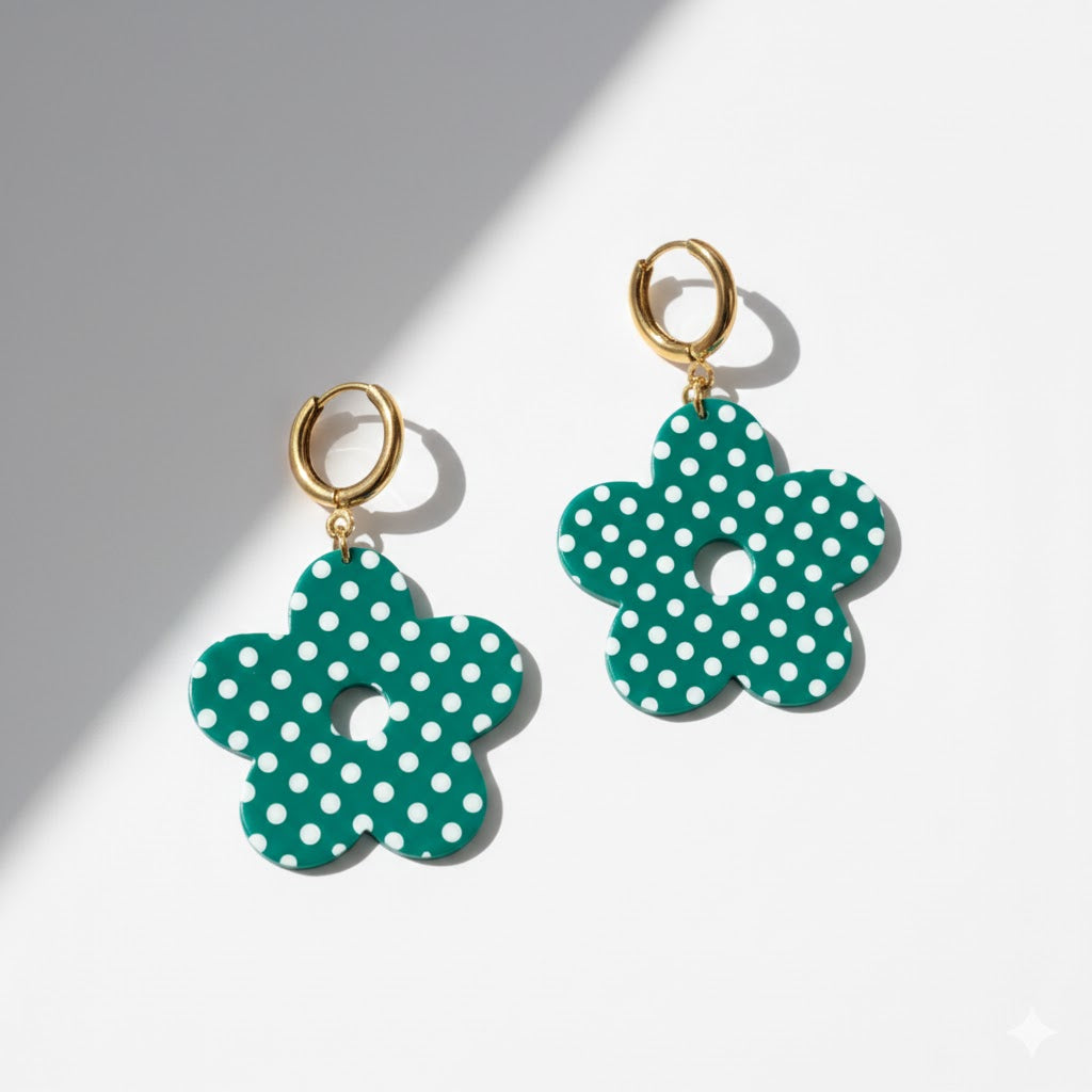 Les boucles d'oreilles Zaya sont à la fois ludiques et élégantes. Elles associent une fleur verte à des pois blancs pour une touche rétro irrésistible. Légères et confortables, elles sont parfaites pour rehausser n'importe quelle tenue d'une note fraîche et originale.